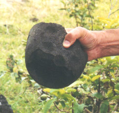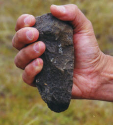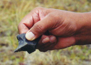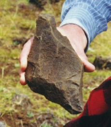 Everywhere we walked we found stone tools. The basalt tool at left is for chopping. The obsidian implement at right with its sharp point, could be used to punch or drill a hole. These tools fit the hand easily and naturally. Holding them, I imagined the Rapa Nui who used and discarded them centuries earlier. | ![]() |