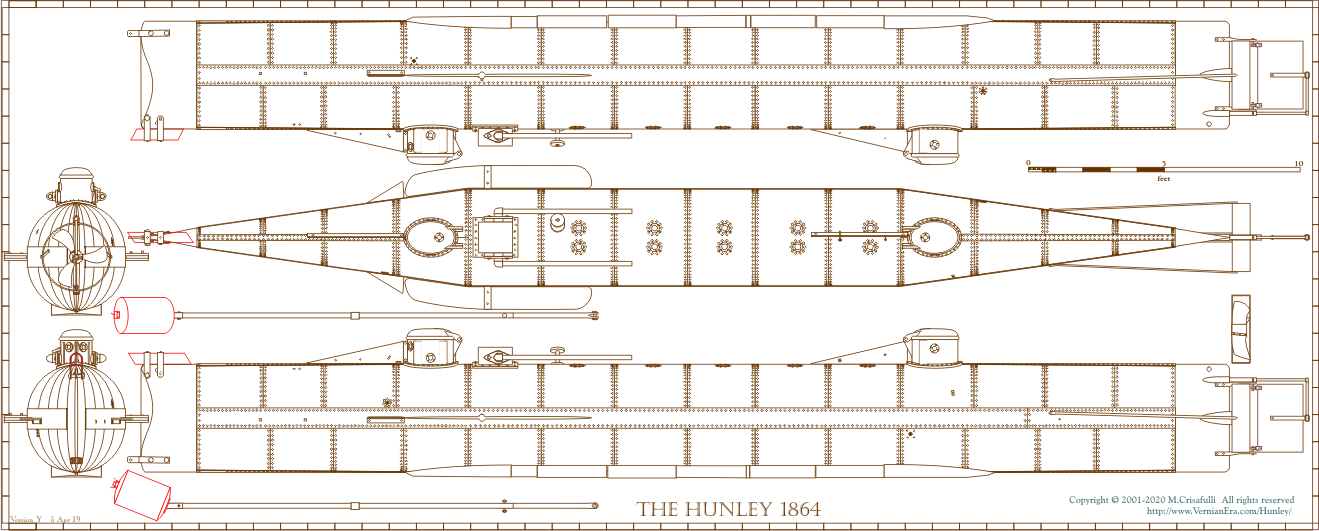 shown by Chapman. I started my original plan way back with dimension and detail information from the National Park Service Site Assessment Report, available via a link on my Hunley page. Reports and photos of removal of the hull plates provided significant data on the size of the plates. The central hull took form from rivet counts and examination of a number of photographs, and from reported dimensions. I’m confident of the accuracy of the four removed plates, but the two remaining plates are more speculative. Finally, I adjusted the hull shape based on close examination of laser scan images published in the Friends of the Hunley Blue Light newsletter. A more recent change, dividing the formally long most forward and aft tank quarter plates in two, is much less accurate, based on a two or three cropped Post and Courier photos. The photos show a narrow plate on the top of the hull joining the forward ballast tank quarter panels together. I've assumed this plate runs the length of the tank section and that a similar plate is used on the bottom. Likewise I've added these structural details to the aft section. This narrow plate is consistent with Chapman's painting, where it appears as dark line along the top of the aft hull. Chapman also depicts the division of the aft tank quarter-panels mentioned above. Click the now obsolete low-resolution drawing below for a detailed five-view plan of the Hunley. (Note that Internet Explorer reduces the image size to fit its window. Click the expansion icon in the lower right-hand corner to view it full size.) |