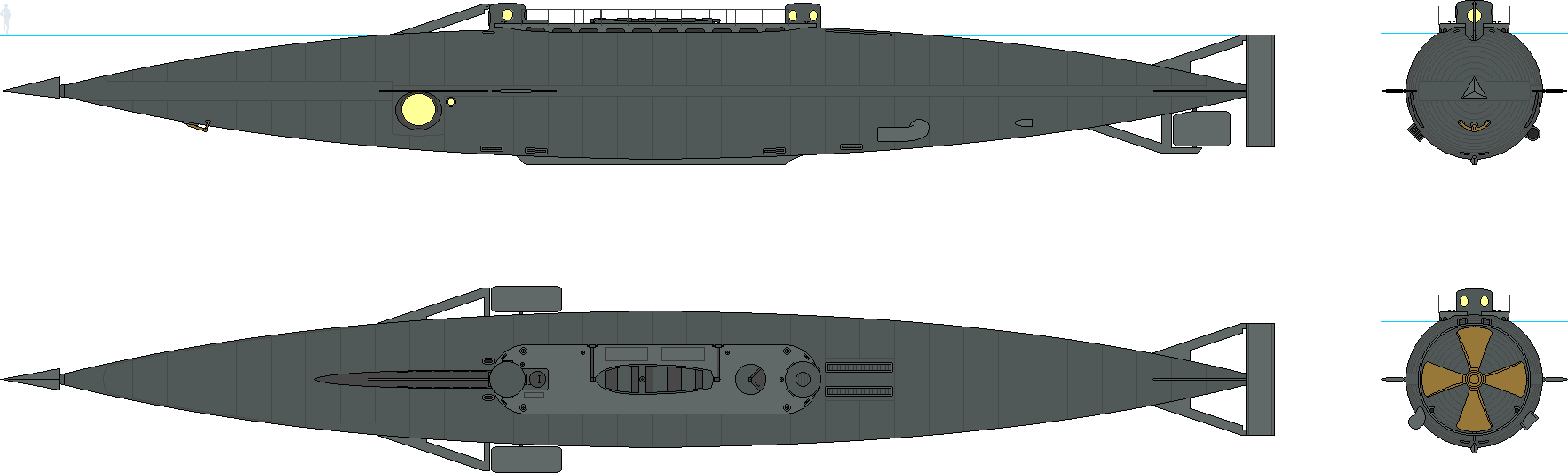 departures from the text are intended to protect vulnerable components from the shock of impact. There are also a number of embellishments not described in the novel, but whose presence might be inferred from the necessities of operating a submarine (though I’m not an engineer). Of course, aesthetic judgments play a role in any design decision. I ultimately wanted something that would be recognizable both as the Nautilus of the book and as a product of 19th-century technology. Like many others, I turned to the Hunley and Winans reconstructions for inspiration. The results are illustrated in the included figures. On to the tour!
