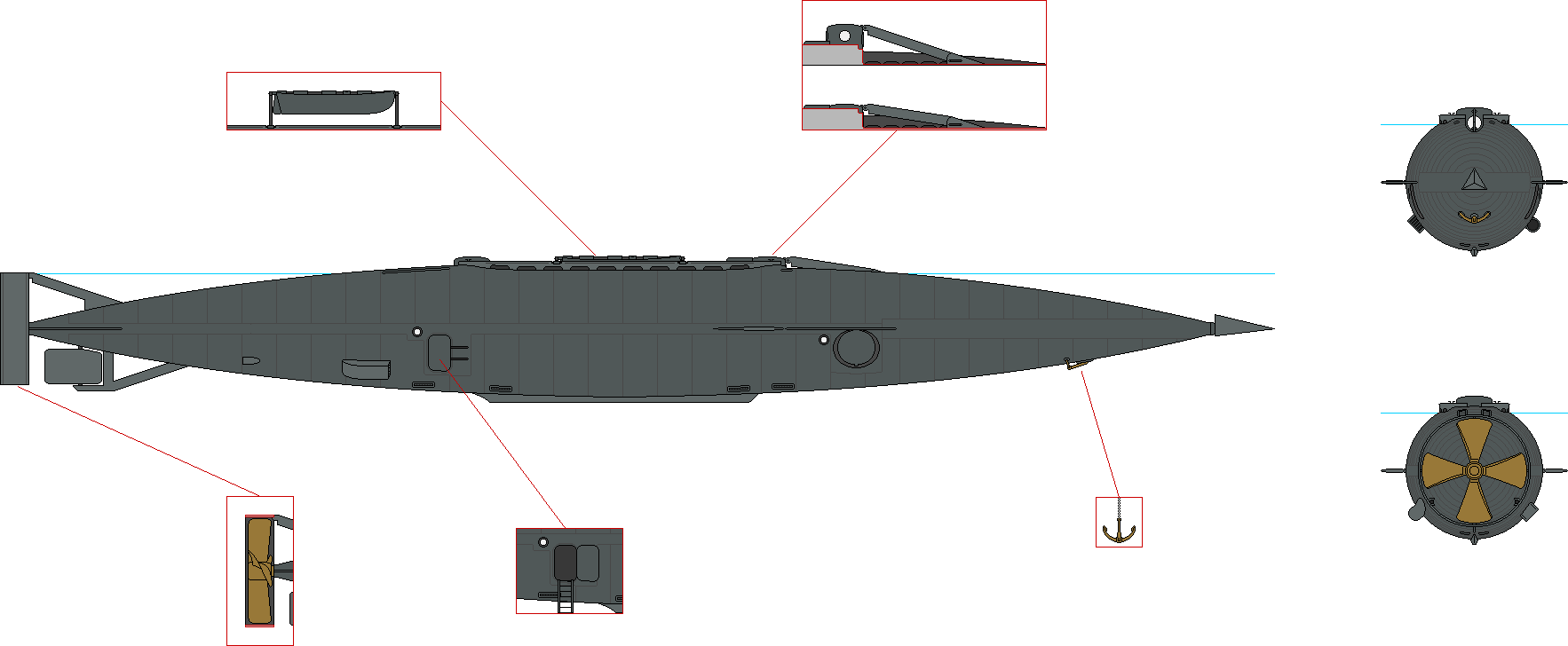 either side. The propeller is four-bladed and based on that of USS Monitor.