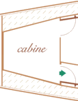 In my original design this cabin was a uniform 2½ meters wide for a floor area of about 6½ m2. A larger area would have been achieved by angling the walls as I did here. A more important difference was the presence of a single door rather than the two here, allowing much more leeway in placing furniture. Leo Arnold has suggested placing the bed on the forward wall would result in better use of the available space. |