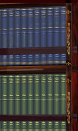 The basic decor of the room, especially the ceiling, is based on details of the interior of the First Congregational Church in Binghamton, New York, built in the 1800s. As pictured, the room contains about 11,000 volumes. The shelves near the lights need to be filled and shelves will be added to the remaining bare wall area. I used a velvet texture for the couch upholstery, but I'm not satisfied with it. I may try a brocade, more like that pictured in the woodcut. |